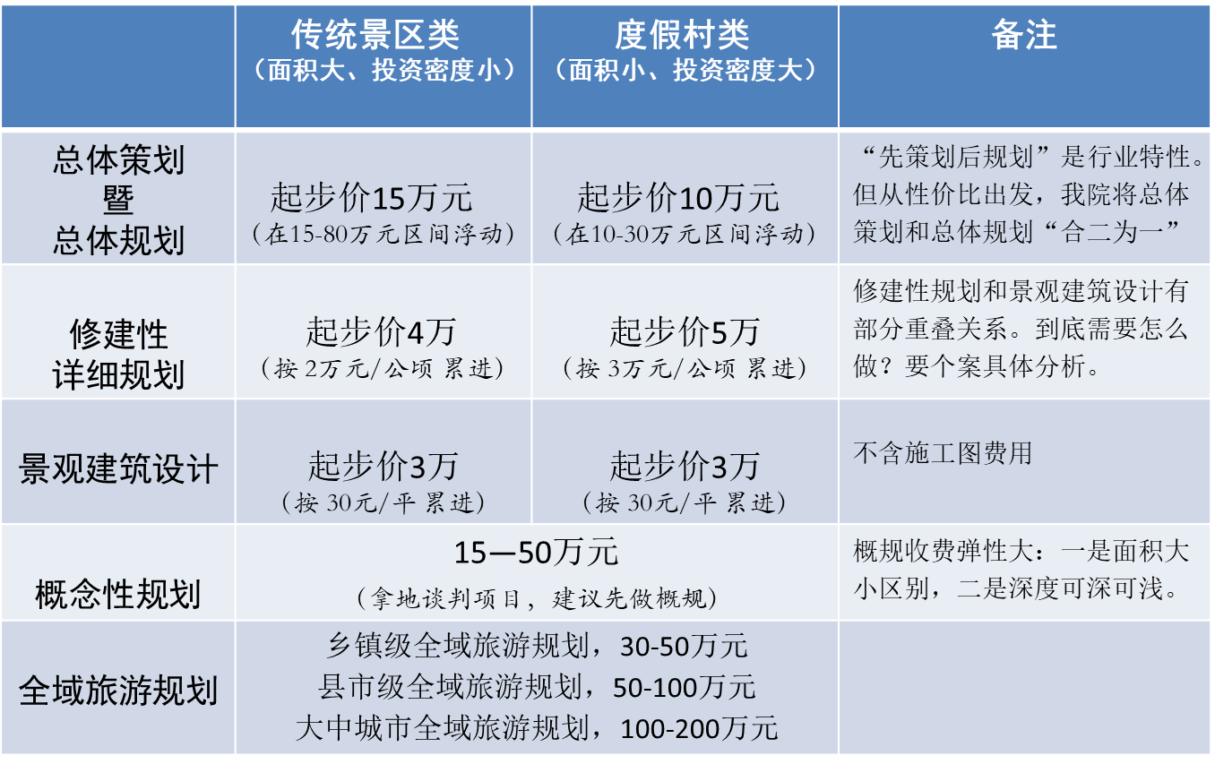 首先必須說明,旅游規(guī)劃收費(fèi)并無所謂的“標(biāo)準(zhǔn)價(jià)格”,但很多客戶還是表示希望“知根知底”,所以至道規(guī)劃院就結(jié)合多年經(jīng)驗(yàn)及行業(yè)...